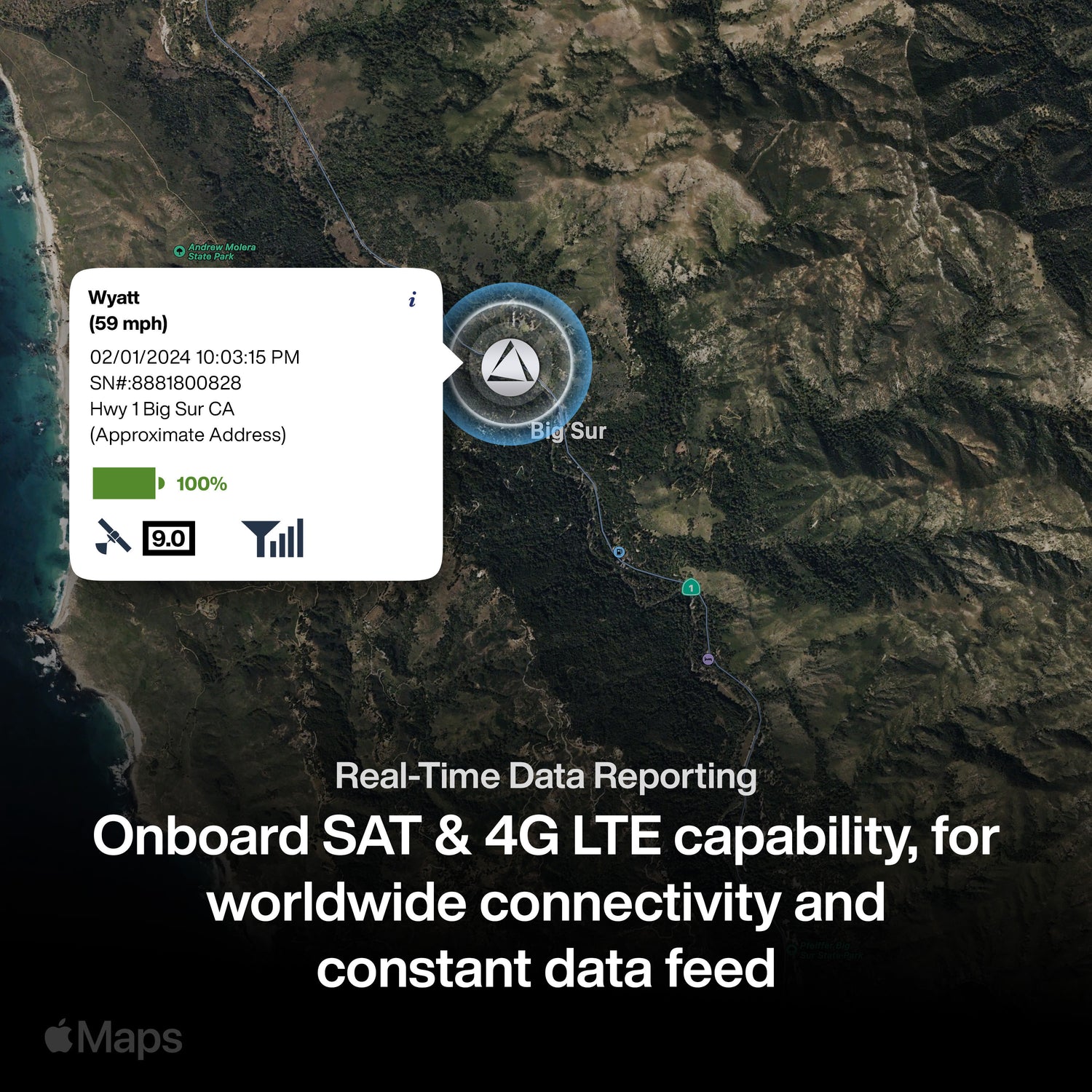 • Tracking Technology: Uses 4G LTE + satellite for accurate real-time location updates.