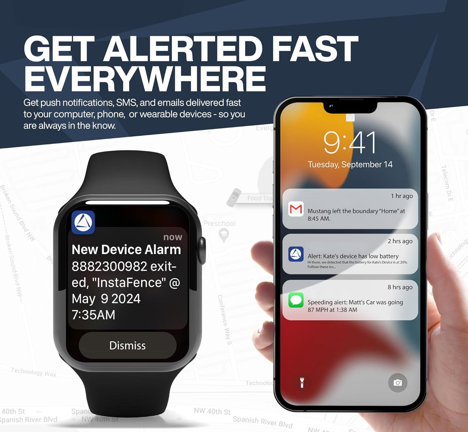 • Geofencing & Alerts: Set up geofencing zones and receive instant notifications for movement or entry/exit.